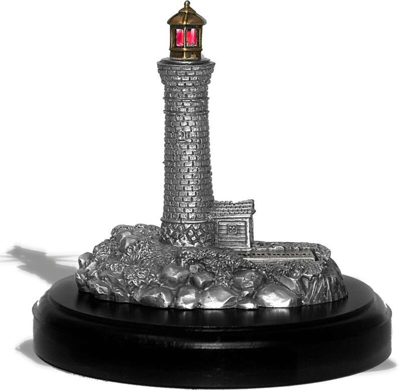 The "North Harbor" figurine is an actual working replica lighthouse. It's made of genuine fine pewter and hand polished in a rich satin luster as shown. The base is hand made in wood and finished in a blackened lacquer. The figure stands 5 inches tall on the base.